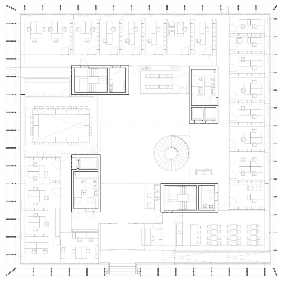 Pisarne so razporejene po obodu kocke v nadstropjih, večji skupni prostori, sejne sobe ter govorilnice pa so v notranjem delu med štirimi komunikacijskimi in konstrukcijskimi jedri. V prvo nadstropje, kjer domuje uprava, vodi polževo stopnišče.