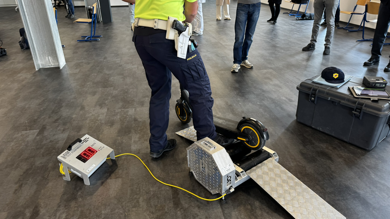 Policija je maja predstavila mobilno napravo z valji, s pomočjo katere lahko na terenu odkrivajo uporabnike mopedov in še posebej e-skirojev, ki presegajo največjo dovoljeno hitrost 25 km/h. Prevozno sredstvo z gnanim kolesom zapeljejo na valje ter ga poženejo do maksimalne hitrosti vrtenja, naprava pa ob simulaciji upora izmeri doseženo hitrost. V primeru prekoračitve policist uporabniku odredi kazen v višini 250 evrov zaradi uporabe tehnično neustreznega sredstva v prometu.