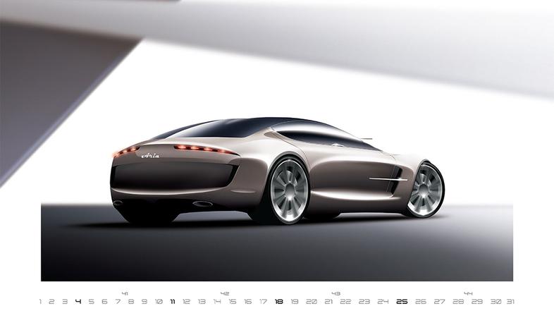 Na 12 stranicah koledarja je v ustreznih barvah in raznolikih pogledih upodobljenih 12 idej neobstoječih avtomobilov različnih karoserijskih izvedb. Ob prečiščeni, pregledni in dovolj informativni grafični podobi koledarja je dizajn avtomobilov potisnjen v ospredje, čeprav ga obrobljajo elementi, katerih naloga je, da pričarajo navidezen prostor in globino. Spreminjanje stranic pričara pestrost in dinamiko, čeprav skozi cel koledar ostaja dobro vidna rdeča nit in značilen slog, še poudarja avtor.