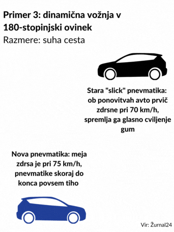 Pri vožnji v suh ovinek je obrabljena guma na sicer grobem asfaltu popustila znatno prej. In bila pri tem veliko glasnejša.