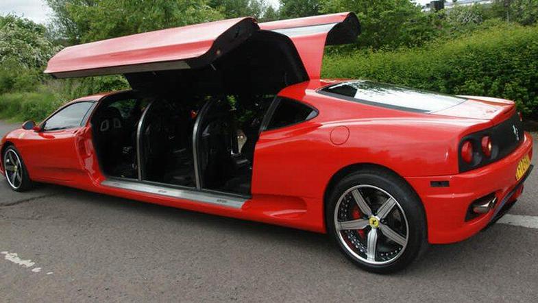 Neki predelovalec avtomobilov si je omislil limuzinsko različico ferrarija z dvižnimi vrati, s katero razvaja mladoporočence.