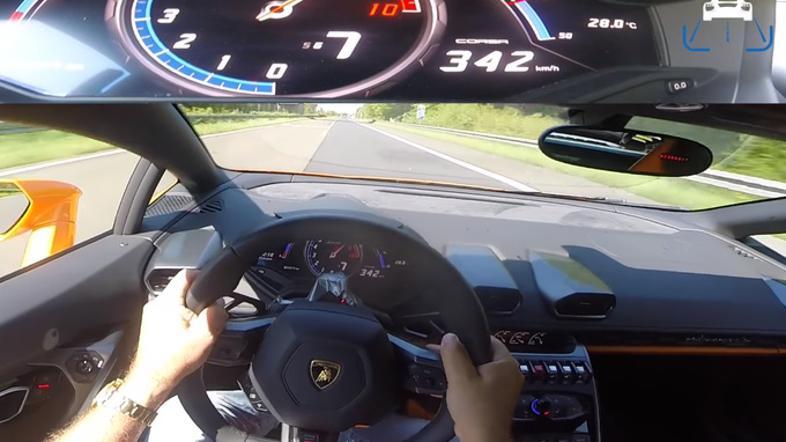 Avtomobil na posnetku je lamborghini huracan, ki ima od dodatkov le Akrapovičev izpušni sistem. Vseeno je na nemški avtocesti (Autobahnu) pospešil preko 340 km/h.