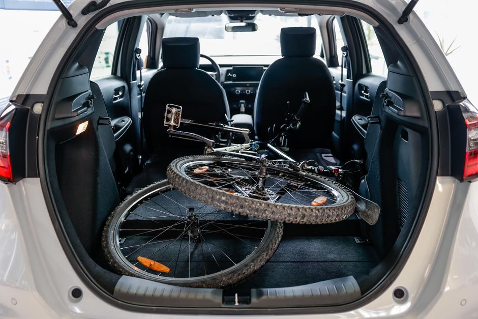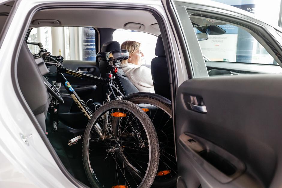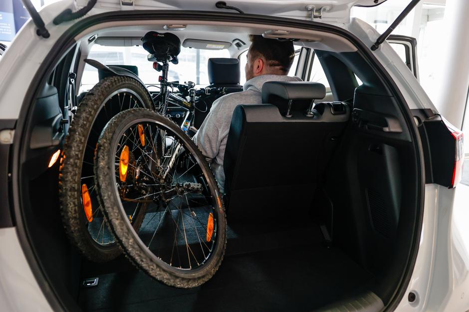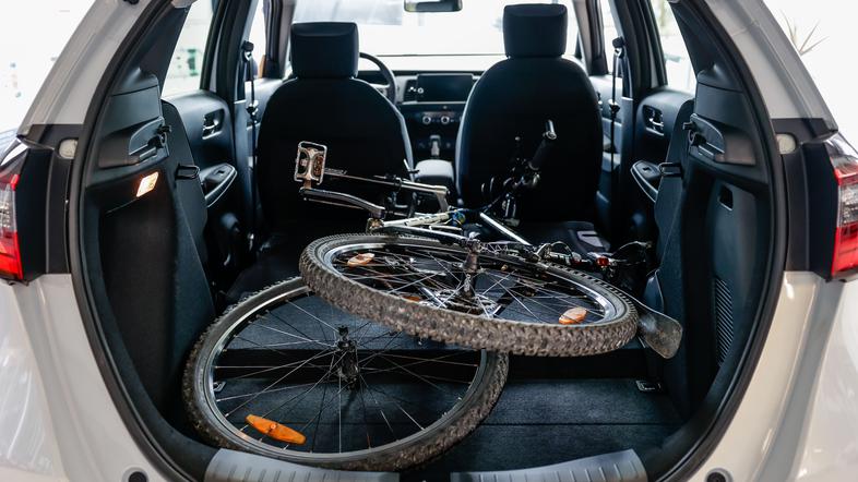 V tako nastali prostor smo tudi lahko v pokončnem položaju naložili kolo z odstranjenim prednjim kolesom, ob tem pa je v prtljažniku ostal še ves prostor za opremo in prtljago, ki jo lahko s seboj na aktivni konec tedna vzameta dva popotnika.