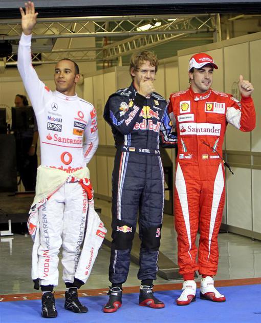 Prvi trije na kvalifikacijah: 2. Alonso, 1. Vettel in 3. Alonso.
