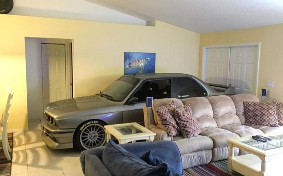 BMW M3 parkiral v hiši