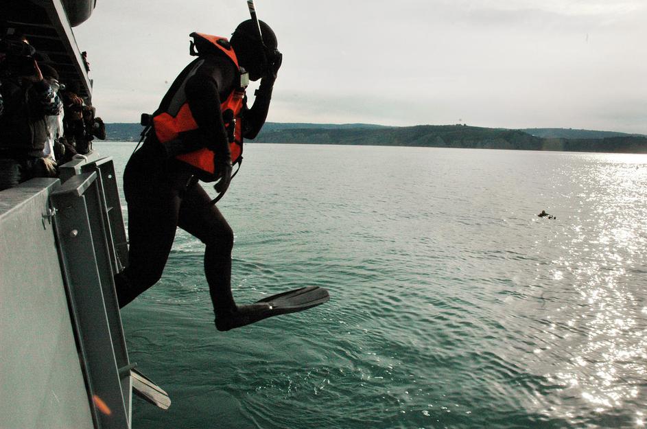 Ko so utopljenca med Izolo in Strunjanom izsledili, se ga je potapljač z ladje pognal reševat.
