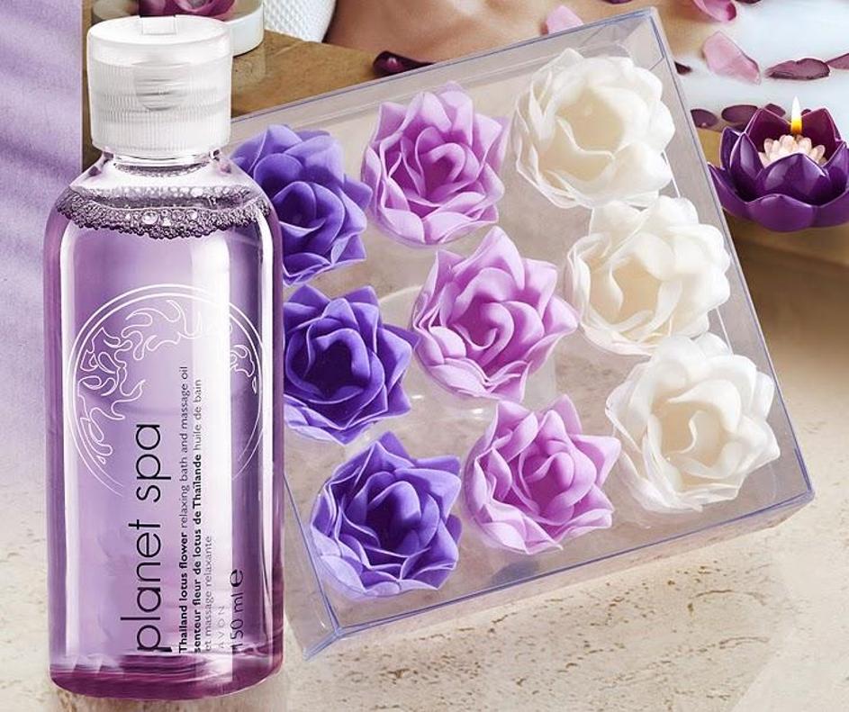 Olje za kopel in masažo, 12 EUR; cvetni listi za kopel - tajski lotus, Avon, 4,50 EUR