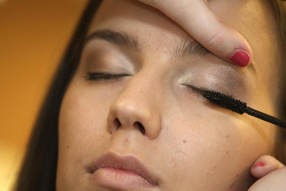 Ličenje oči zaključite z maskaro. Za mačji videz oči maskaro nanesite po celotni površini trepalnic,