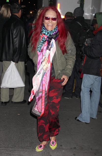 70-letna Patricia Field s kričeče rdečimi lasmi in ravno tako kričečimi oblačili.