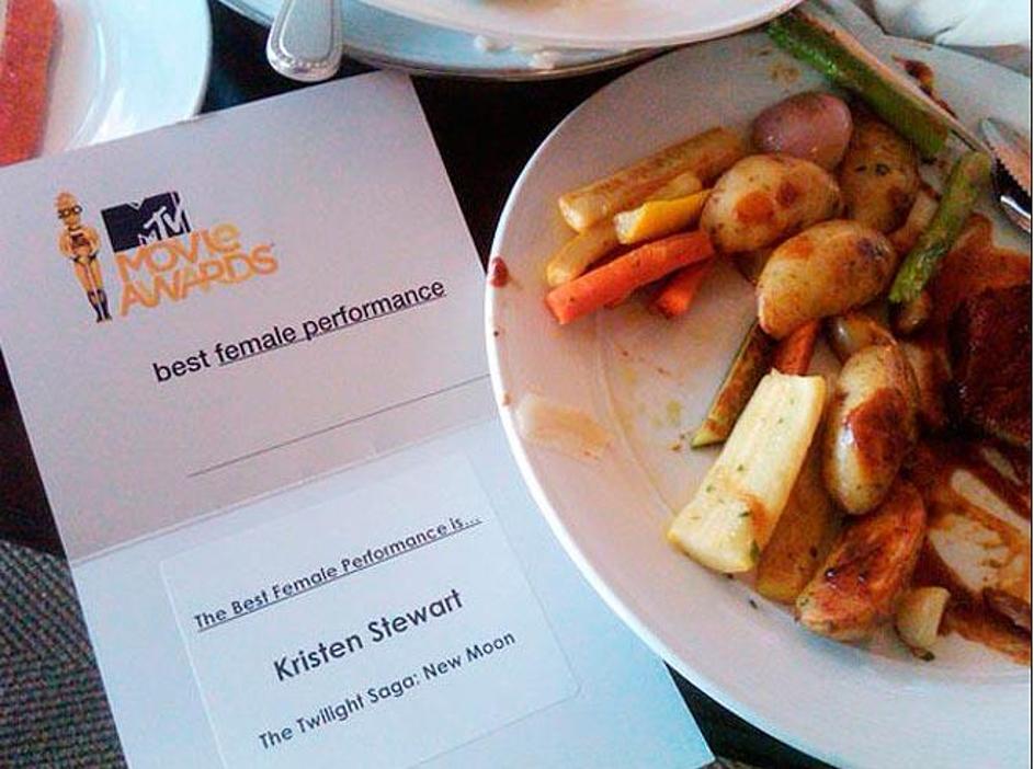Kristen Stewart je pokazala ovojnico, na kateri je zapisano, da je osvojila MTV nagrado za najboljši