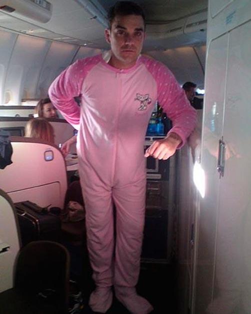 Robbie Williams je pokazal pižamo, ki jo nosi na letalu.