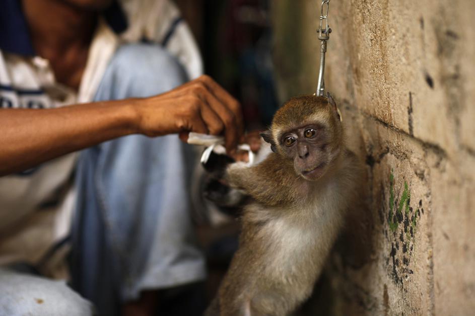 Med čakanjem na nastop so opice zaprte v kletkah.