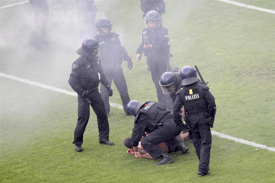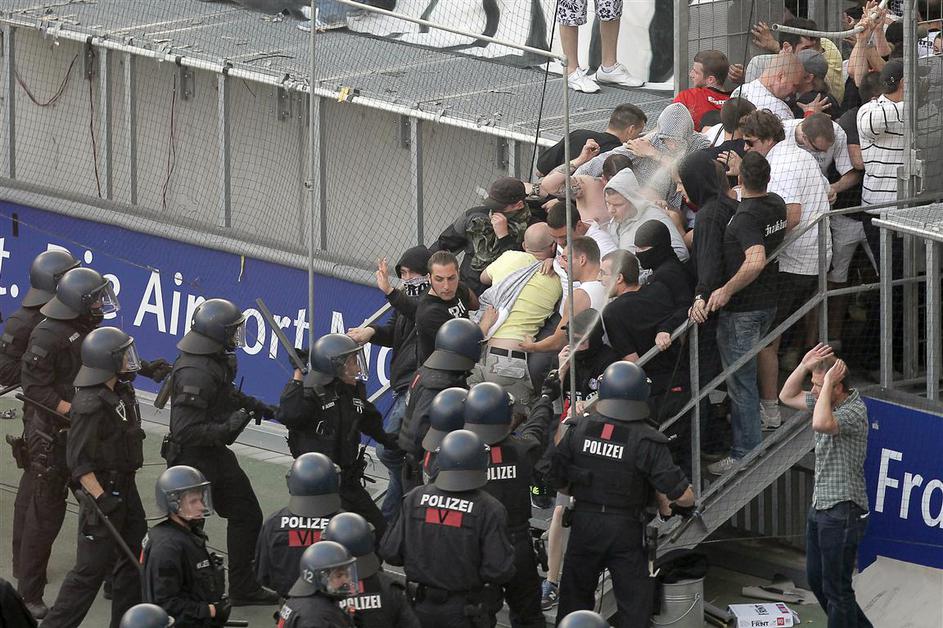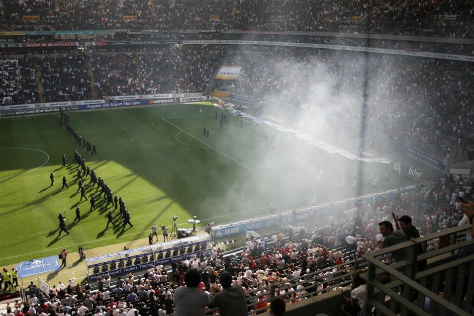 Policisti so morali pobesnele navijače Eintrachta pregnati nazaj na tribuno.