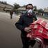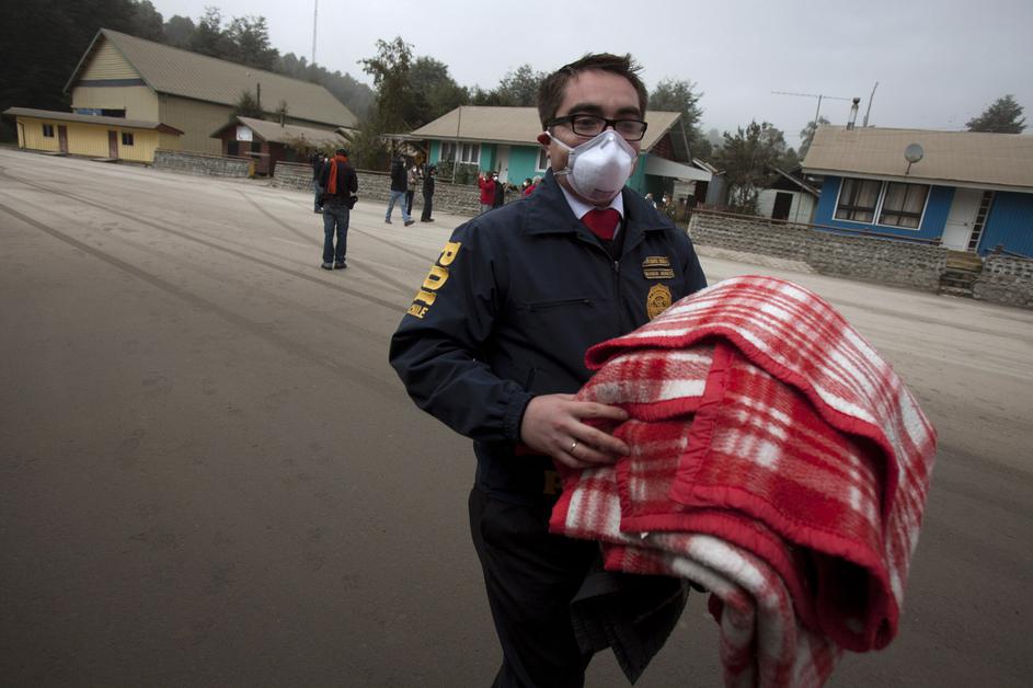 Policist nosi masko za zaščito pred vulkanskim prahom.