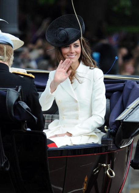 Kate MiddletonKate je zjutraj na proslavi nosila kostim slonokoščene barve ter prikupen črni klobuček. Flynet