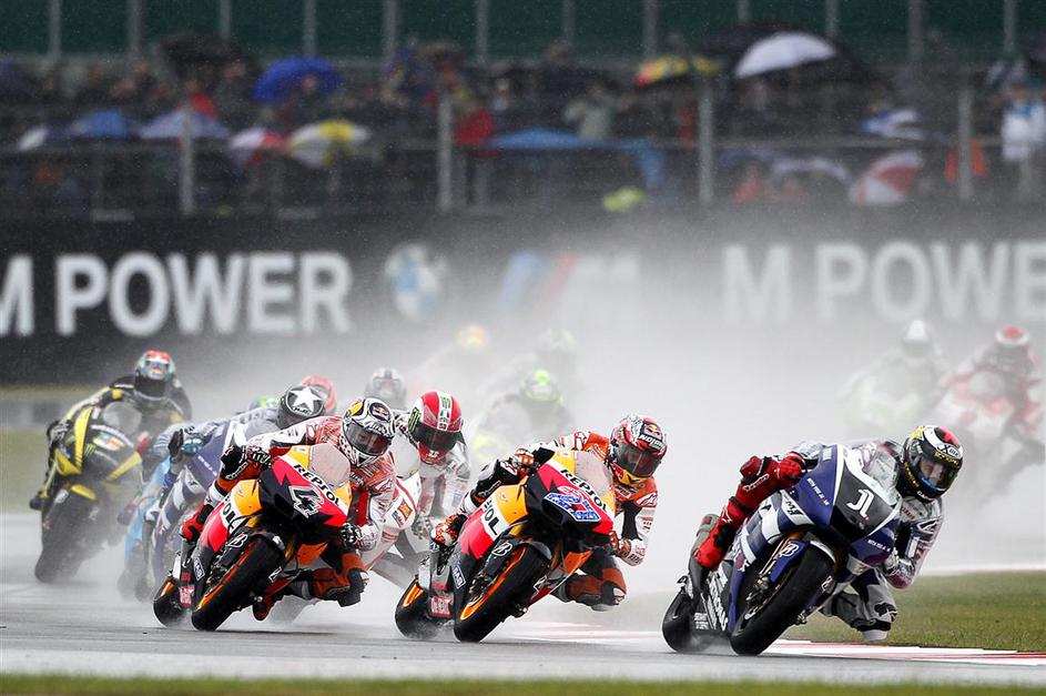 Casey Stoner in Andrea Dovizioso (Honda) ter Jorge Lorenzo (Yamaha)