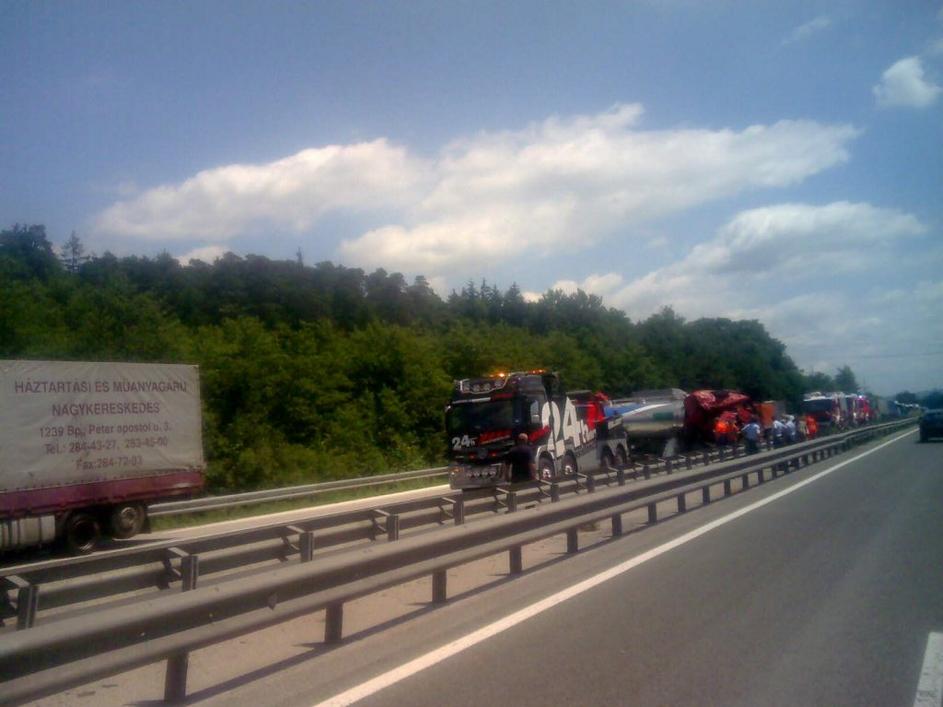Prevrnjena cisterna zaradi katere so na štajerski avtocesti nastali zastoji.
