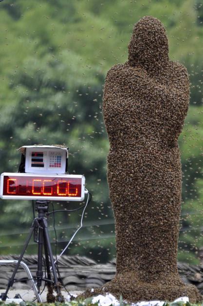 42-letni Wang Dalin, ki je tokrat zmagal le za las, je s pomočjo kraljevih čebel, ki so znane po tem, da čebele privabljajo v rojih, na svoje telo v slabi uri privabil kar 26 kilogramov čebel. Reuters