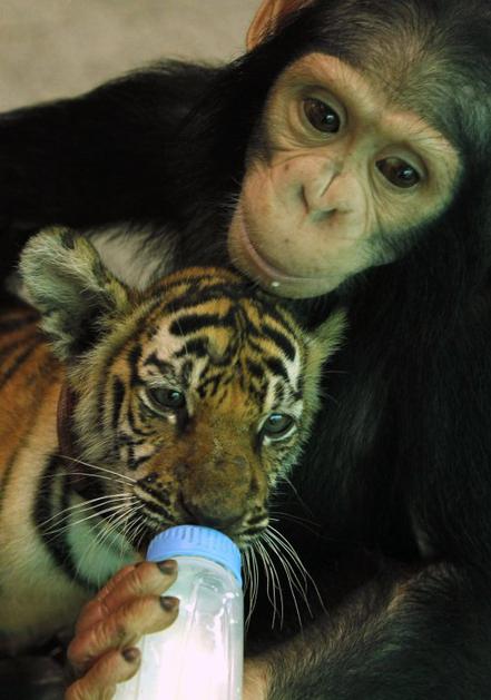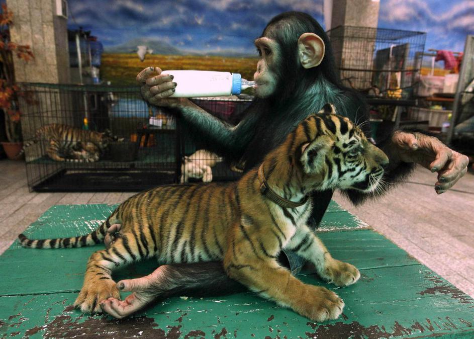 Šimpanz Dodo brez težav skrbi za majhne tigre