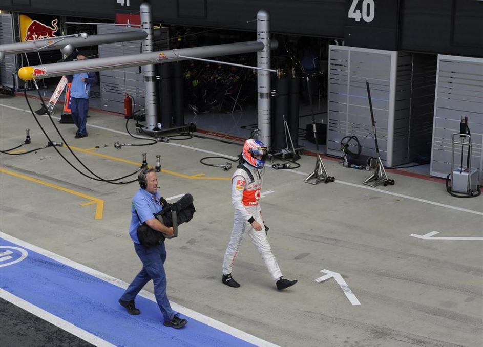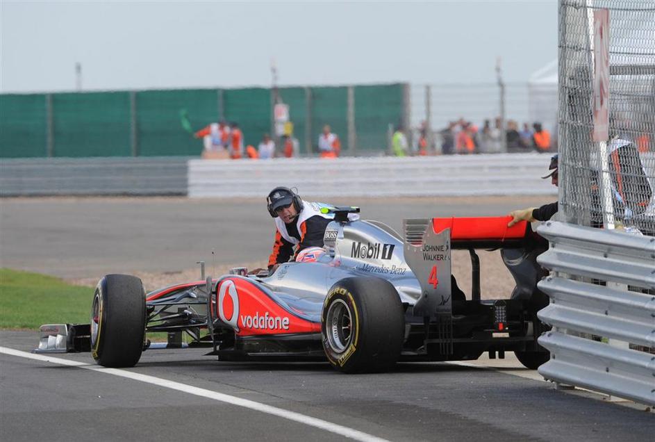 Jenson Button (McLaren) je v Silverstonu zapeljal s postanka ...