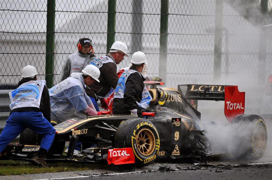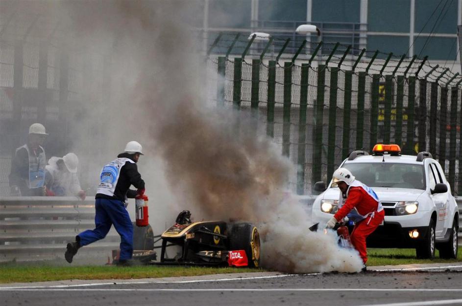 Nick Heidfeld (Renault) se je z akrobatskim skokom rešil pred ognjenimi zublji.