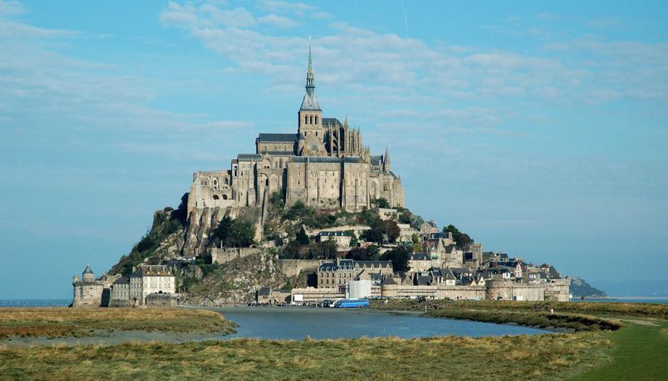 Mont St. MichelMont Saint-Michel, Francija. Ko je plima, je otok, ko je oseka, postane "polotok", s celino povezan s peskom. Granitne skale piramidaste oblike so pozidane v kombinacijo mesteca, gradu in opatije. Mont Saint-Michel je zaščitni znak Normandije. Shutterstock