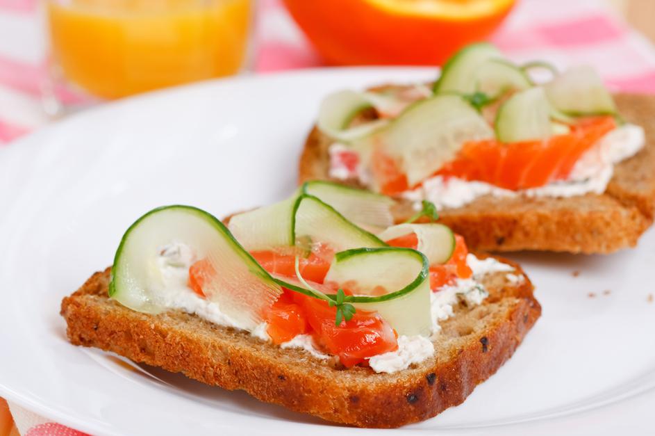 skuta, zajtrk, lososSkutini kruhki z lososom, čas priprave: 5 minut: Na rezino kruha s semeni namažite skutin namaz, ki ga pripravite iz dveh žlic puste skute, malo soli in popra, po želji primešajte malo drobnjaka. Namazan kruh obložite z rezino dimljenega lososa in tankimi rezinami kumare. Shutterstock
