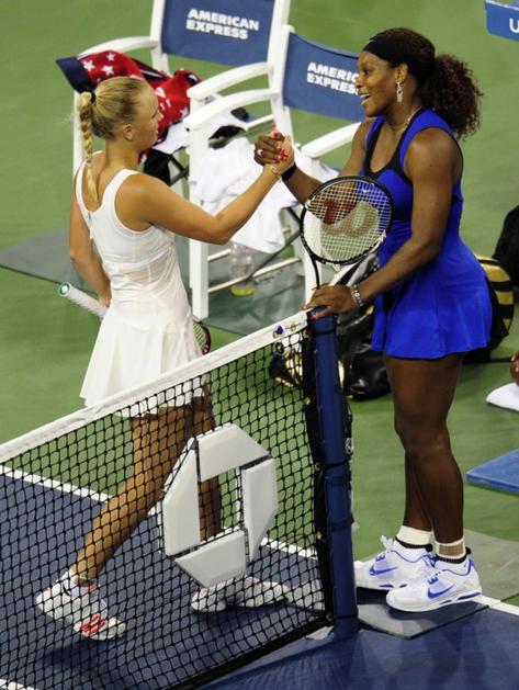 Zaključni pozdrav - Serena Williams (desno) je premagala prvo nosilko Caroline Wozniacki.