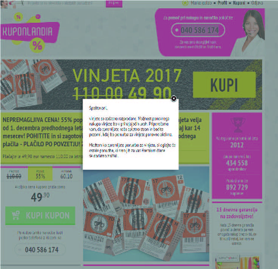 KuponlandijaBralcu se je po plačilu članstva izpisalo, da so vinjete začasno razprodane in da bo možnost ponovnega nakupa " v prihajajočih urah". Bralec