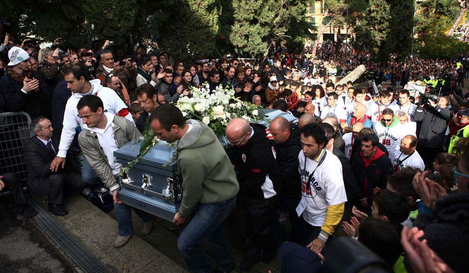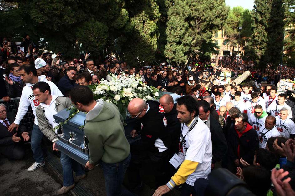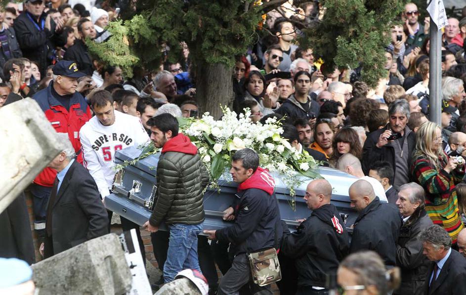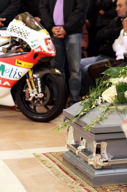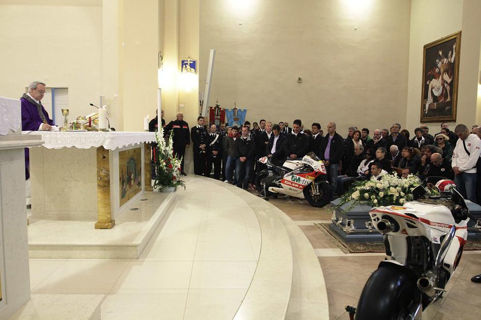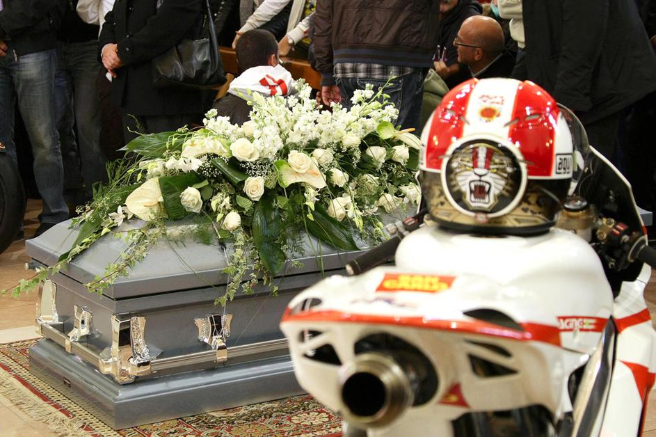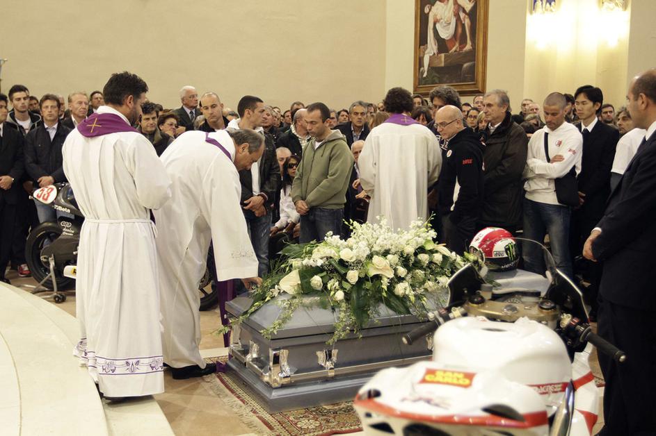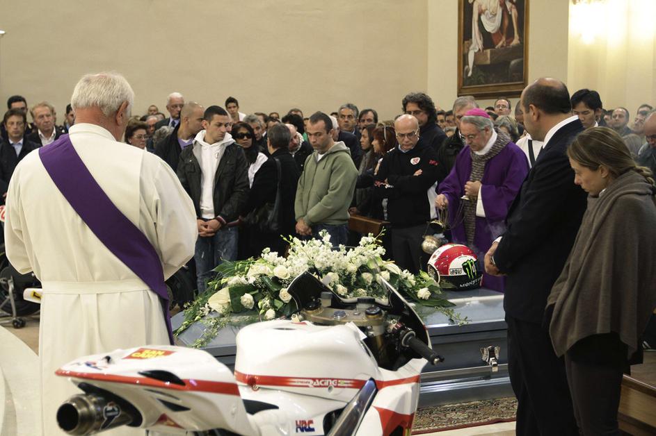 Simoncelli pogrebMarcov oče je uspel urediti, da sta bila v cerkvi tudi gilera 250, s katero je Marco leta 2008 postal svetovni prvak v razredu do 250 kubičnih centimetrov, in honda RC212V, ki jo je Italijan vozil zadnji dve sezoni v kraljevem razredu MotoGP. EPA