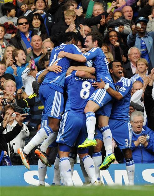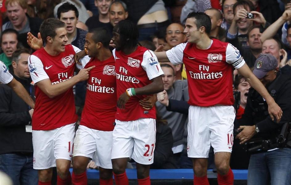 Chelsea – Arsenal, za prvo vodstvo Arsenala je zadel Theo Walcott (drugi z leve), s hat-trickom pa je delo dokončal Robin van Persie (desno).
