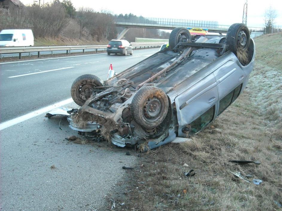 Osebno vozilo se je ob nesreči prevrnilo na streho.