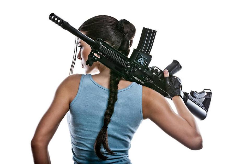 Iris zažiga na fotografijah, ki jih je posnela na snemanju oglasa za paintball puške ...