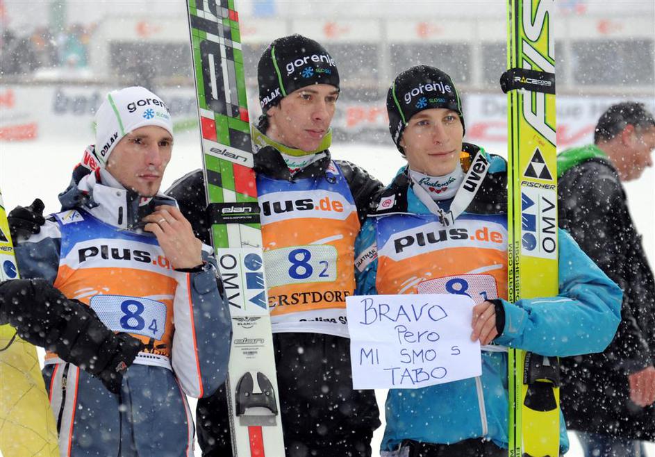 Slovenci na vrhu. Robert Kranjec (levo), Jure Šinkovec (v ozadju) in Jurij Tepeš. "Bravo Pero, mi smo s tabo," so na listu zapisali posvetilo za poškodovanega rojaka Petra Prevca.