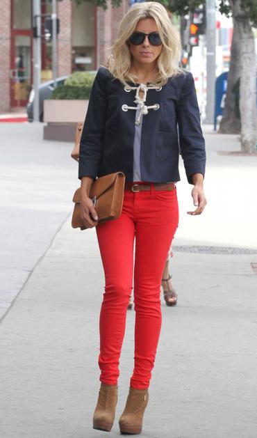 Mollie KingNavadne kavbojke pospravite v omaro in si pomladne dni raje polepšajte z barvami. Pevka Mollie King je navdušena nad rdečimi, ki jih je odlično popestrila z mornarskim suknjičem, bež čevlji in torbico. Videz, ki ga bomo vsekakor posnemali! FameFlynet