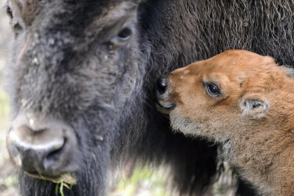 Le nekaj dni star mladiček ameriškega bizona se je pokazal obiskovalcem živalskega vrta de Servion v Švici.