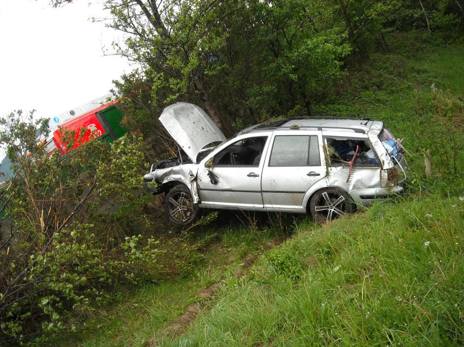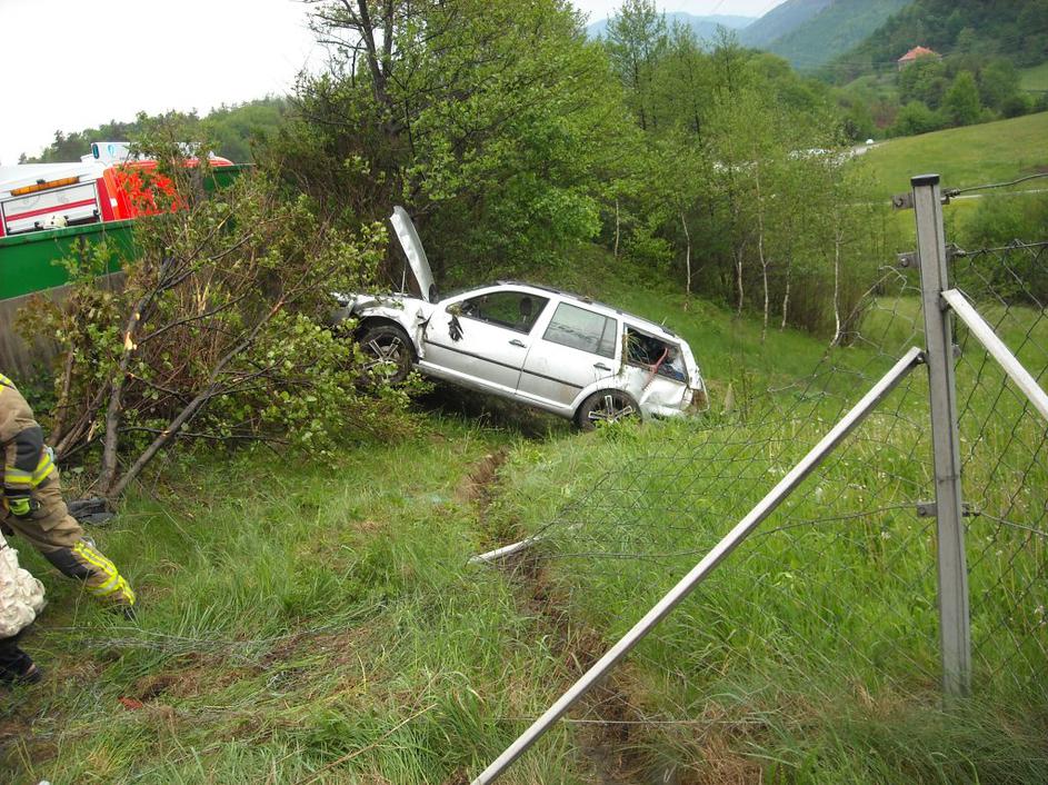 Vozilo se je prevrnilo čez ograjo in pristalo v drevesih. PGE Celje