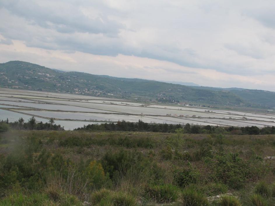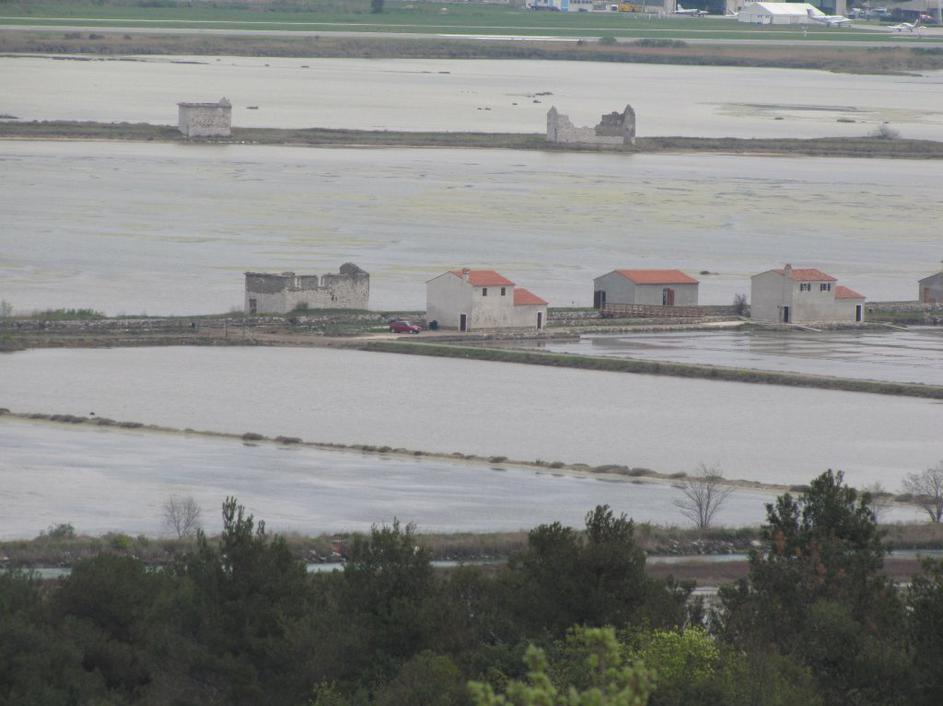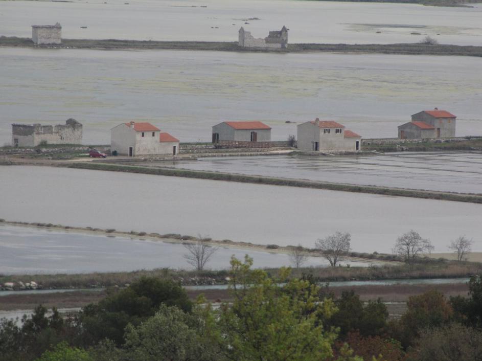Obnovljene hiške na solinah. Slikano iz hrvaške strani.
