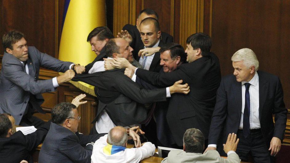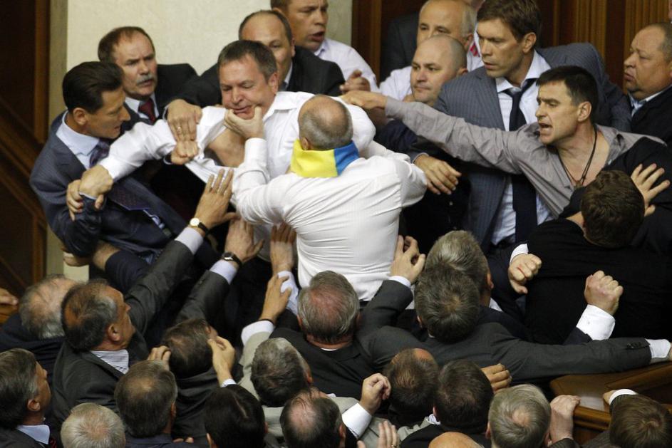 Pretep v ukrajnskem parlamentuZadnji večji pretep je v ukrajinskem parlamentu izbruhnil leta 2010. Takrat je zdravniško pomoč potrebovalo kar šest poslancev. Reuters