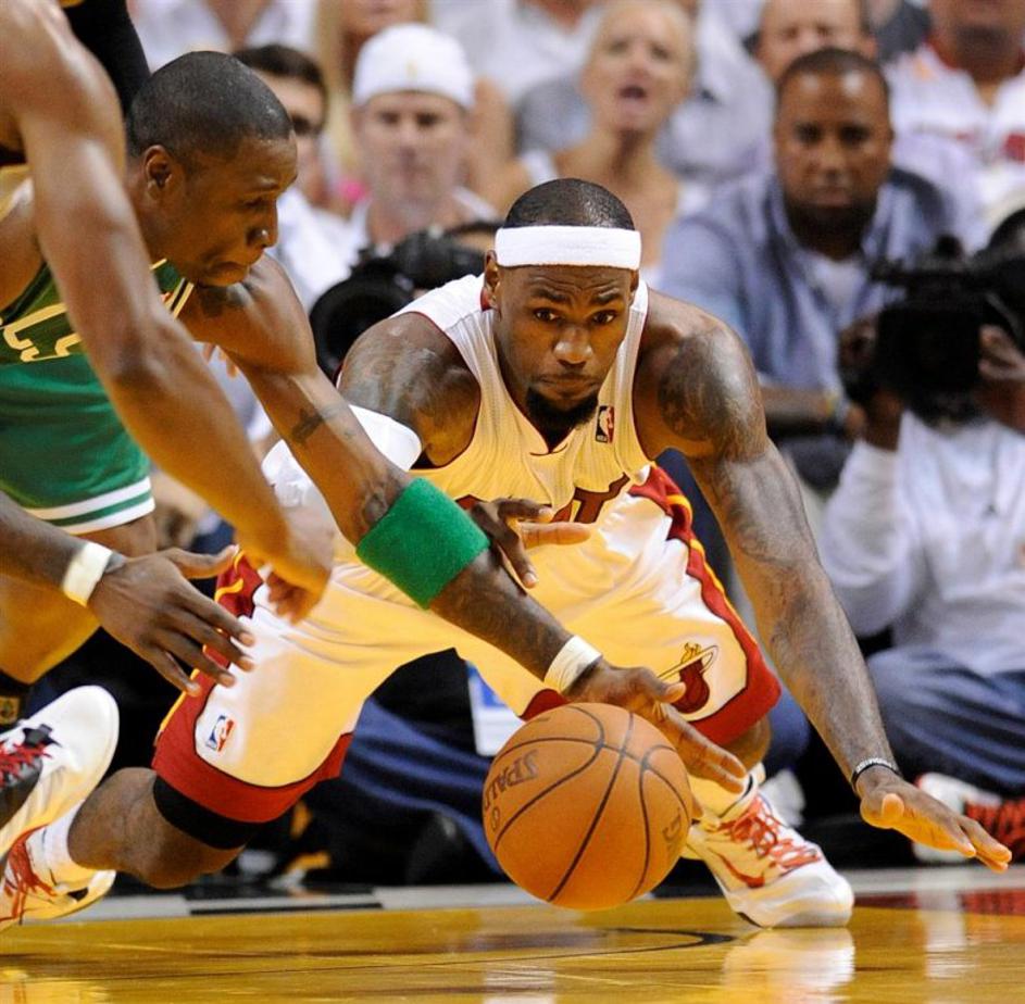 (Miami Heat - Boston Celtics) James v boju za žogo z Mickaelom Pietrusom.