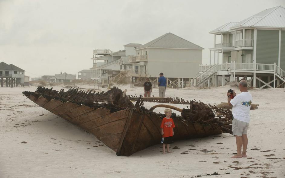 Stara razbitina ladje, ki jo je naplavilo ob orkanu Isaac.