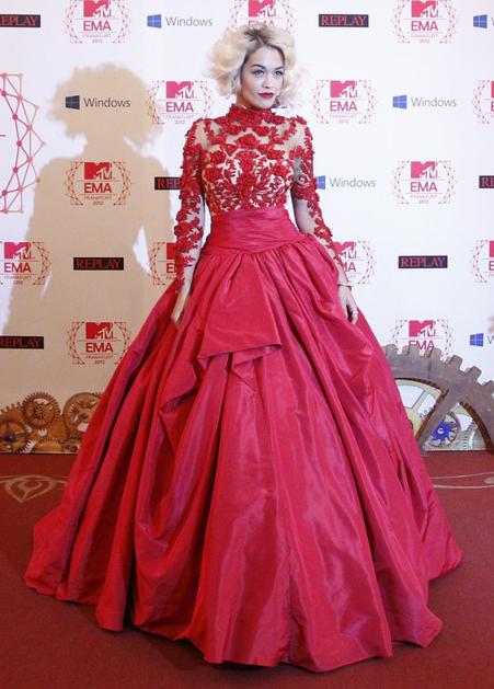 Rita OraZa nastop se je pozneje preoblekla v rdeč hlačni kostim, ki tudi ni bil najbolj posrečena izbira. Reuters