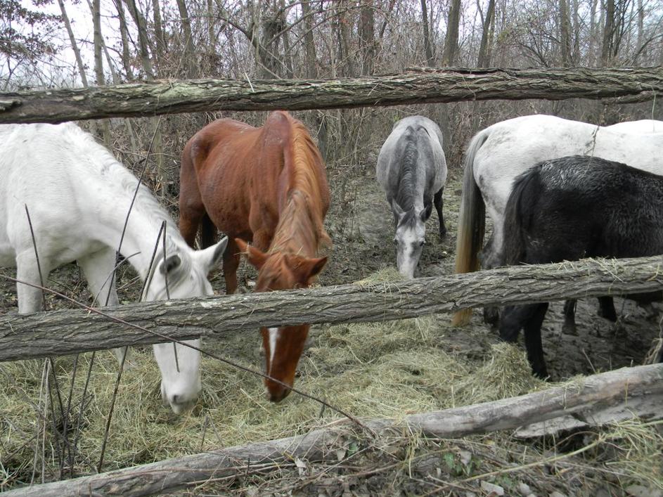 Konji so takoj, ko so jim iz društva pripeljali seno, začeli jesti.