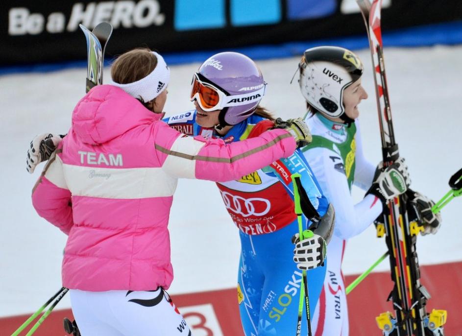 Tina na stopničkah s Kathrin Zettel in Viktorio Rebensburg.