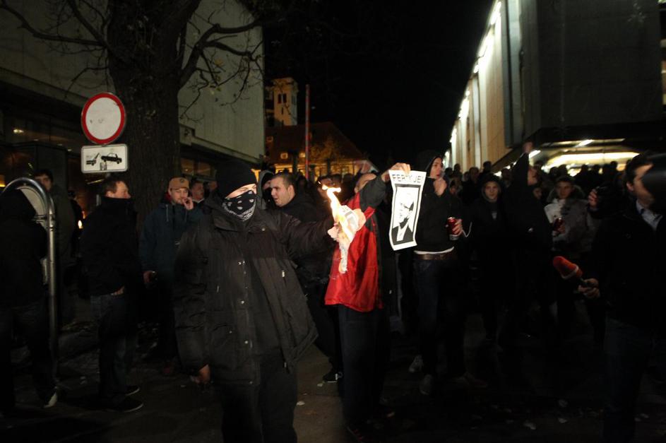 Protestniki so zažgali plakat s sliko notranjega ministra Vinka Gorenaka.