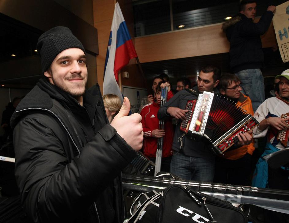 Mušič Slovenija reprezentanca hokej povratek letališče Brnik olimpijske kvalifik