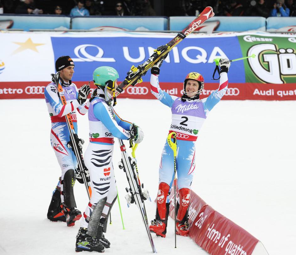 Zmagovalci (z leve proti desni): Felix Neureuther, Marcel Hirscher in Mario Matt.