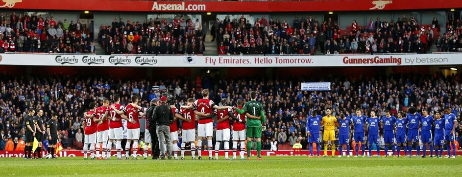 arsenal evertonZ minuto molka so počastili tudi žrtve bombnega napada na bostonskem maratonu in obeležili 24. obletnico tragedije na stadionu Hillsborough v Sheffieldu (Arsenal - Everton). EPA