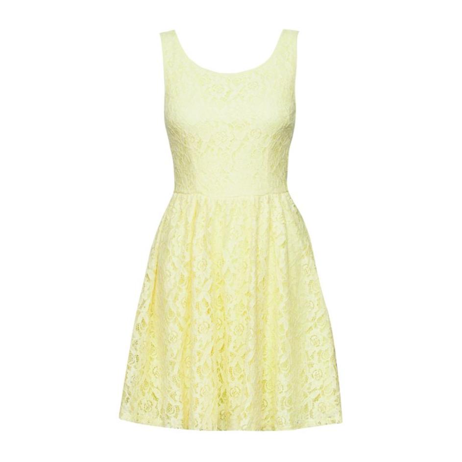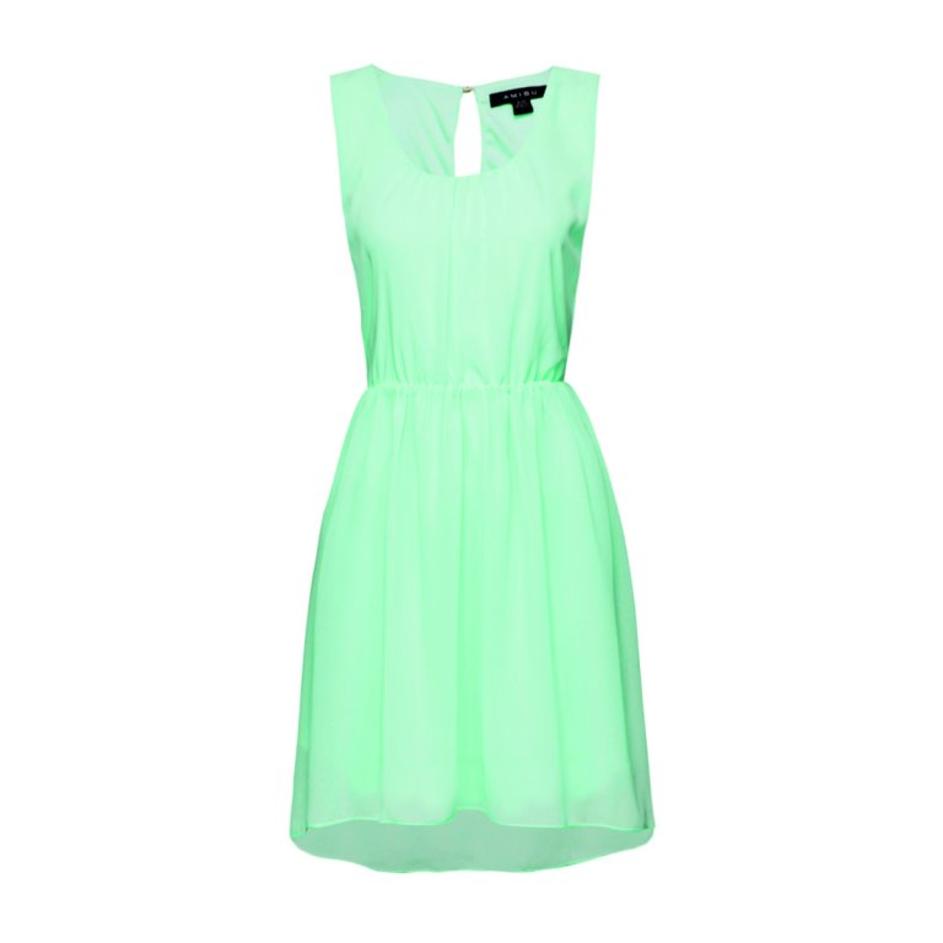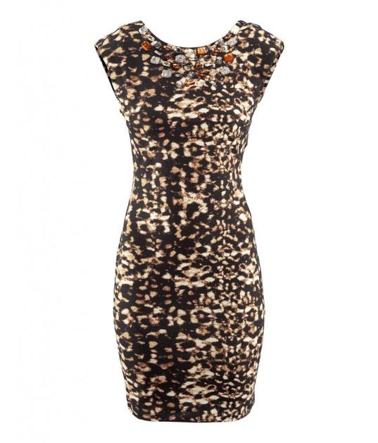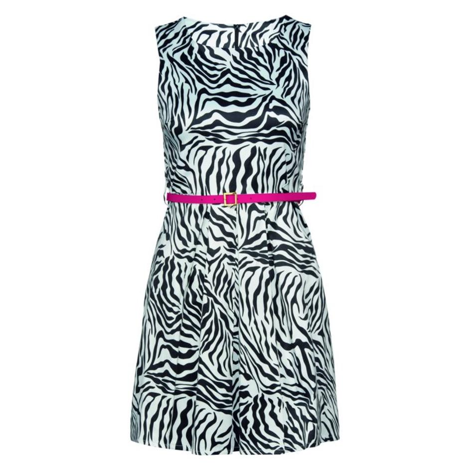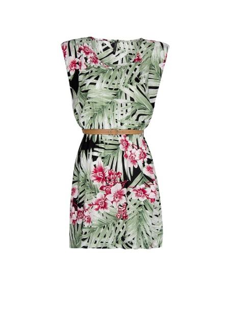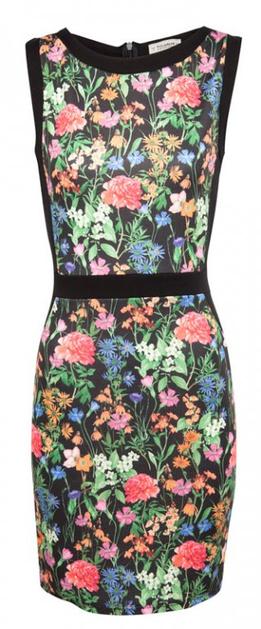 Zablestite v obleki s tropskim motivom.