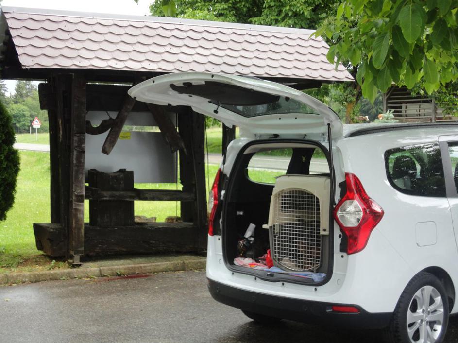 Avtomobil francoskega para. V prtljažniku kletka s psom.